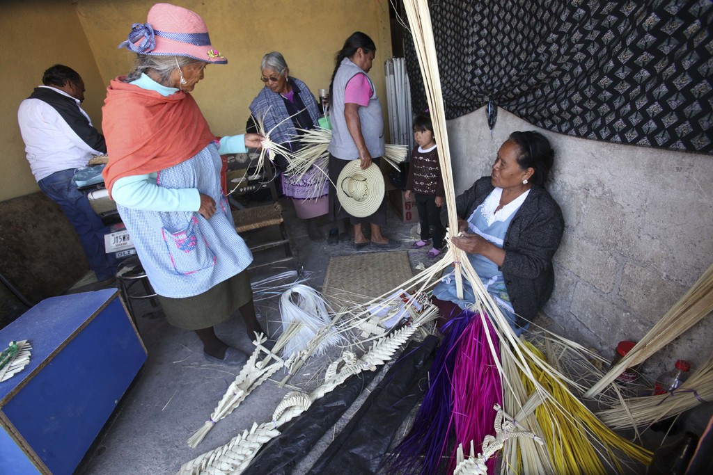 Las cruces y palmas son figuras que únicamente elaboran mujeres, desde niñas, a los 10 o 12 años, y hasta las ancianas del pueblo, localizado en la zona norte de la capital mexiquense. Son viviendas pequeñas, de gente con ingresos muy bajos, la mayoría se dedica al comercio de productos como sombreros, bordados en tela o joyería de chaquira y estambre.