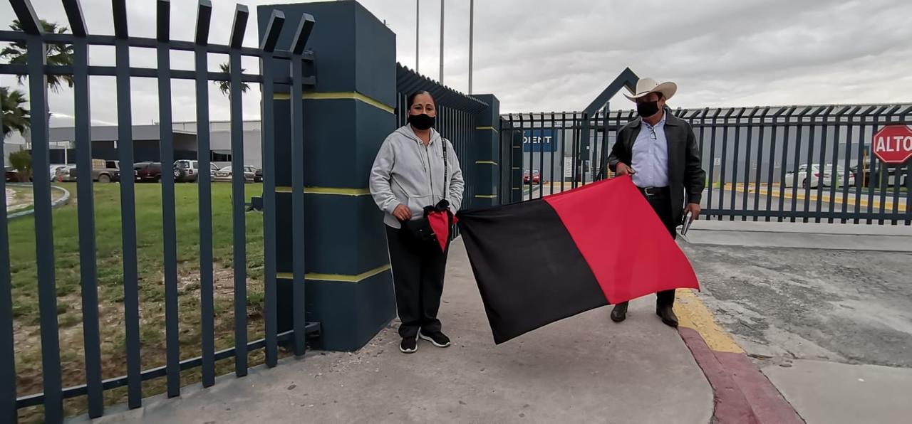 Una ex trabajadora de una maquiladora que fabrica forros para asientos automotrices, se plantó en el exterior de la compañía con una bandera rojinegra acompañada de su abogado, para exigir su finiquito por despido injustificado.