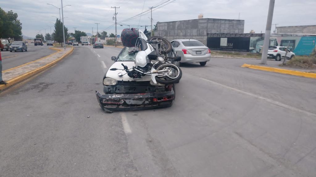 Por unos segundos de distracción, una motocicleta terminó en el cofre de un vehículo compacto la tarde de este martes, al norte de la ciudad de Saltillo.