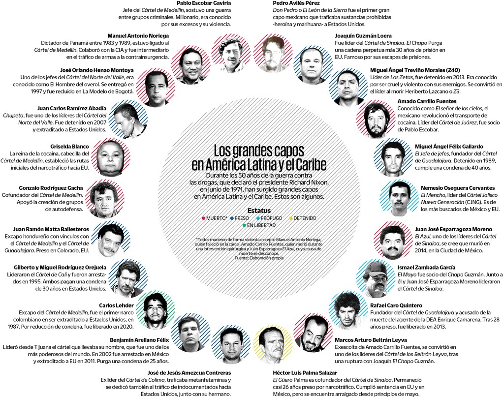 Luego de que Estados Unidos declaró en 1971 la guerra contra las drogas, en un acto sin precedentes en la historia mundial del crimen organizado, las mafias de México y Colombia se transformaron, aprovecharon la prohibición de los estupefacientes para empoderarse en cárteles y enriquecerse, con lo que emergieron personajes que concitaron una mezcla de odio y amor, y de repudio y admiración, sobre todo en América Latina.
