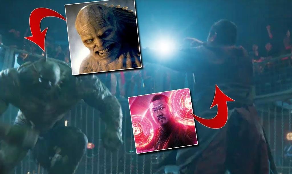 Y es que al final del tráiler se puede apreciar una secuencia de apenas unos segundos en la que se ve al protagonista de la película en un enorme local similar a una discoteca, que tiene dentro una jaula de pelea suspendida en el aire y sujeta por cadenas. En su interior dos personajes de Marvel luchan a muerte: se trata del hechicero "Wong” y el colosal “Abominación”.
